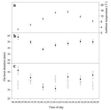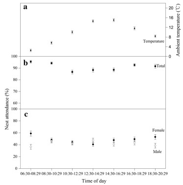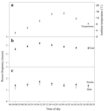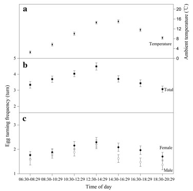 Results At lower ambient temperatures in the morning, crane parents spent more time on the nest with less recess frequency and prolonged on-bout duration, while at higher temperatures around noon, the parents had more frequent recesses from incubation and shorter periods between nest exchanges. They adjusted the amount of time incubating by varying the recess frequency and the length of on-bout duration. Mean nest attendance and egg turning frequency of females were significantly higher than those of the males. The nest attendance and on-bout duration of females showed a significantly negative relationship with those of males. The two parents responded differently to the change of temperature. Females spent more time on the nest at lower morning temperatures, while males increased their time on the nest at higher temperatures after noon. Higher incubation recess frequency and egg turning frequency were observed at noon, probably because parents spent more time foraging, taking advantage of the lower egg cooling rate.