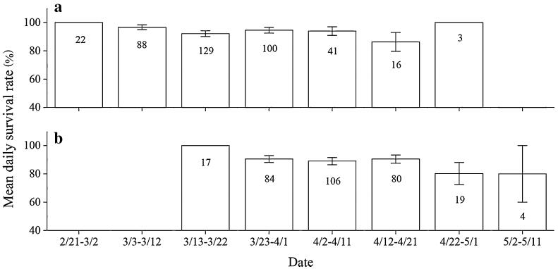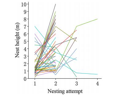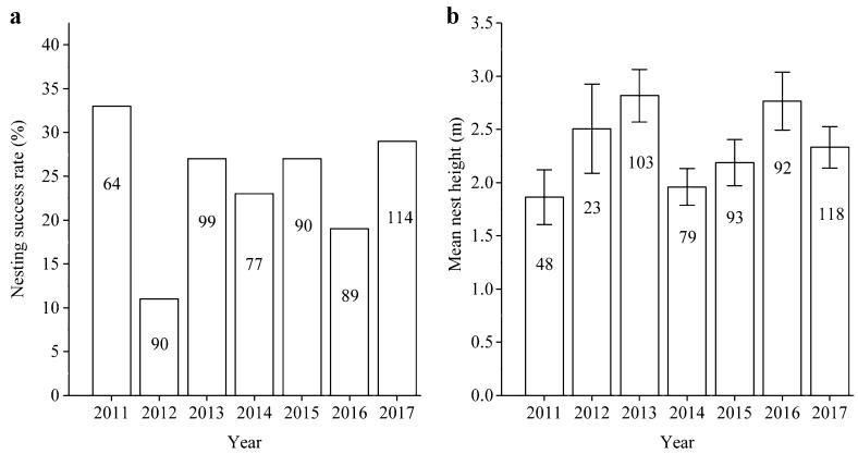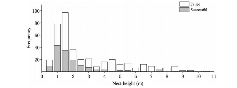 Results The overall nesting success rate was 24.1% (n = 623). Among the failed nests (n = 472), 59.75% were predated by birds and mammals, followed by snakes (9.11%). The average height of successful nests was significantly lower than that of predated nests. As the season progresses, the height of the nests increased significantly, companied by the decrease in nesting success. Daily survival rate of the nests also decreased with the progression of the season, regardless of breeding stages.