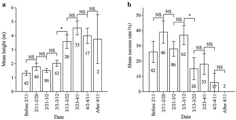 Methods We monitored nests of the Silver-throated Tit across seven breeding seasons in the Dongzhai National Nature Reserve in Henan Province of China. We compared the difference of nesting success among nests of different heights and analyzed the effect of nesting date on nest height and nest predation rates.