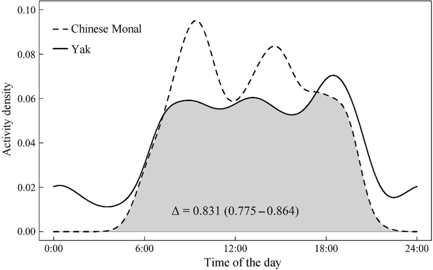Free-ranging yak grazing is a regime specially adapted to high-elevation environments across the Pan-Tibetan Highlands, yet its impacts on alpine birds remain poorly understood. The Chinese Monal (Lophophorus lhuysii) is a rare pheasant species that serves as a representative and umbrella species for alpine meadow ecosystems in the mountains of Southwest China, and has long been regarded as threatened by free-ranging yaks. However, the actual impacts and specific mechanisms through which yak grazing influences Chinese Monal have not been empirically tested. Here, we conducted infrared camera monitoring in alpine meadows within the Wolong National Nature Reserve, Sichuan, China, from 2019 to 2022. We analyzed the effects of free-ranging yaks on habitat occupancy, activity pattern, and population density of the Chinese Monal using multispecies occupancy models, kernel density estimations, avoidance attraction ratios, and random encounter models. We found that interactions with yaks affect monal habitat occupancy in conjunction with other ecological factors. Specifically, the presence of yaks alters monals’ occupancy responses to variations in grass cover and elevation, causing monals to use habitats with lower grass cover and elevation more frequently. Additionally, the activity patterns of the Chinese Monal and yaks are significantly different, and the presence of yaks significantly prolongs the time until monals re-occupy the same habitats. As an outcome of the cumulative effects of spatial and temporal avoidance, the population density of the Chinese Monal negatively correlated with increasing grazing intensity. This study provides the first empirical evidence of the negative impacts of free-ranging yaks on the Chinese Monal and elucidates the underlying mechanisms, highlighting great risks to conservation of this vulnerable species. Our findings inform the optimization of grazing management that balances production with conservation. Strict control over yak numbers and grazing areas in critical habitats for Chinese Monal and other threatened species could be a feasible compromise to mitigate these pressures.