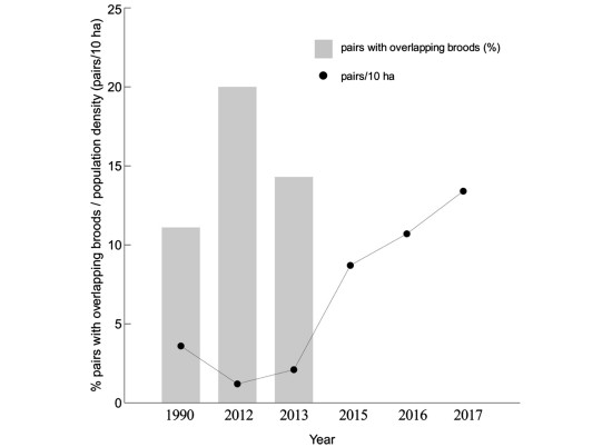 Conclusions Laying overlapping clutches enabled pairs to shorten their average breeding cycle by 15-21 days and produce more offspring. It is possible that overlapping breeding attempts is a density-dependant strategy, enabling the population to restore after severe declines, however, alternative explanations are also possible. Future studies are needed to better understand mechanisms underlying the occurrence of this phenomenon.